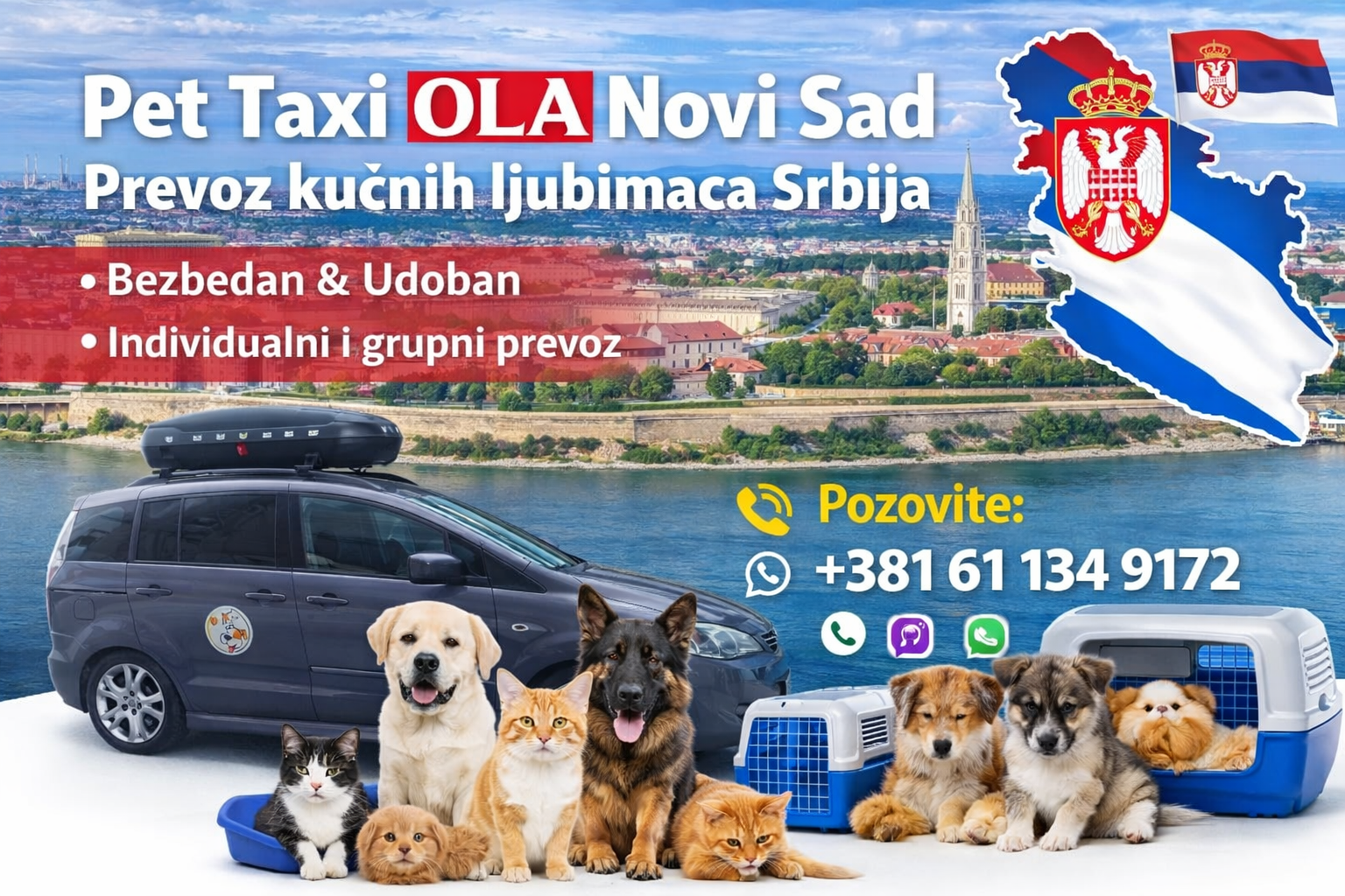 Pet Taxi OLA Novi Sad pruža profesionalan i pouzdan prevoz kućnih ljubimaca iz Novog Sada ka svim gradovima u Srbiji. Naš tim obezbeđuje maksimalnu sigurnost, udobnost i brigu tokom celog putovanja.